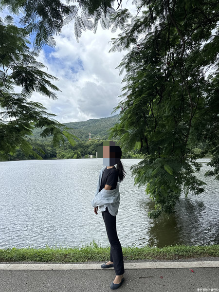 벤치에 앉아 호수를 바라보며 멍을 때리다가, 나도 아쉬워 셀카를 찍어보다가 스을쩍 옆에 있던 학생에게 사진 한 장을 용기 내 부탁했다. 호텔에서 급하게 나오느라 쌩얼에 머리도 엉망이었지만, 호수를 배경으로 멋진 한 컷을 남길 수 있었다.