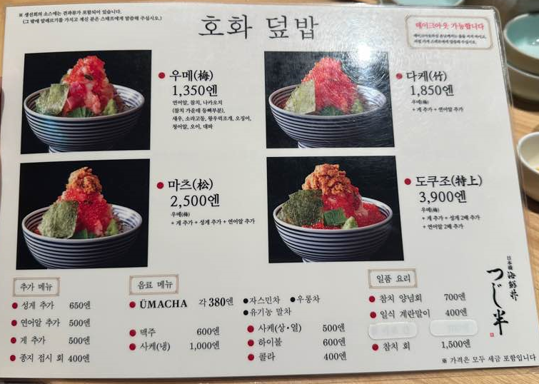 가격은 또 얼마나 착한지. 밥 위에 산처럼 덮여 나오는 호화덮밥. 노른자 간장에 고추냉이를 풀어 열심히 먹고, 밥이 1/3쯤 남았을 때 요청하면 국물을 덮어주시는데. 와 정말 끝이다. 너무 맛있다.